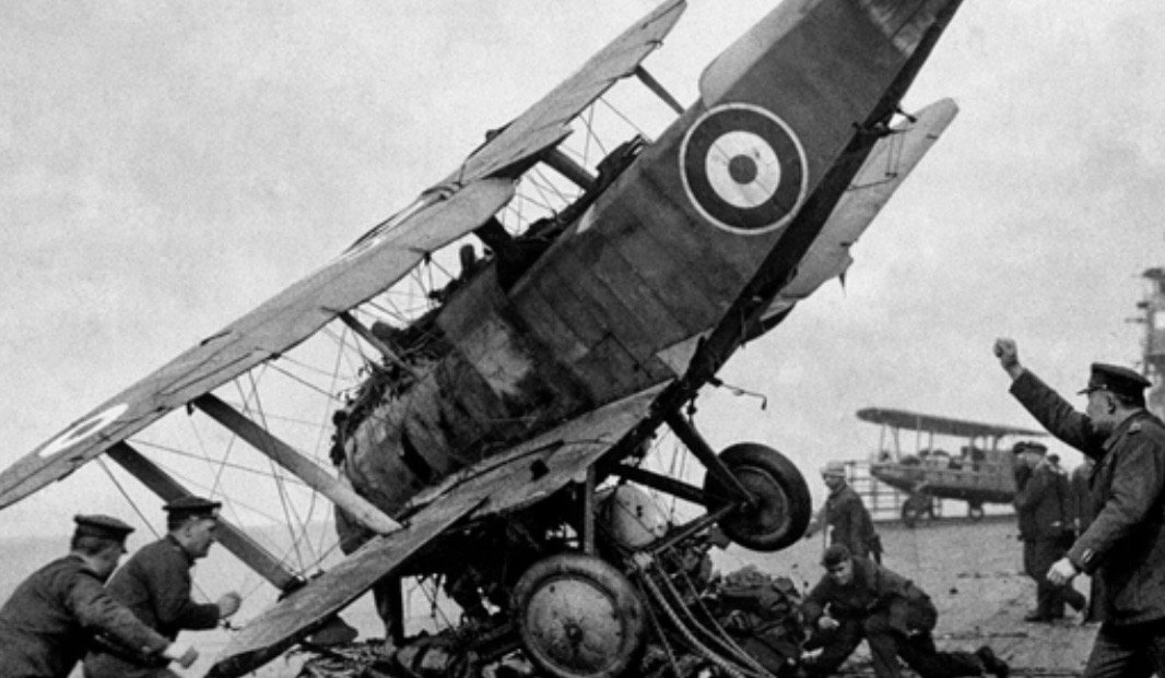 وبحاملات الطائرات الأولى التي ابتكرها البريطانيون، أجريت العديد من التجارب التي أثبتت إمكانية الإقلاع من على متنها. وفي الأثناء، لم يتمكن الطيارون من الهبوط عليها مجددا لأسباب عديدة.