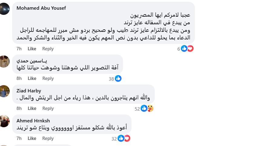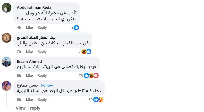 وعلق أحد متابعيه قائلا: النبى كان ينجز فى الطلب، أي في الدعاء لا بهذا التنطع والتشدق والمبالغة، ما الضرر فى قوله ربنا آتنا فى الدنيا حسنة وفى الآخرة حسنة وقنا عذاب النار فيما قال آخر: إتق الله في نفسك لأن الرياء يتسلل في نفسك، بينما علق ثالث:سبحان الله القبول من عند الله… مش عارف ليه يا أخي مش بستريح لطريقتك أقسم بالله.. ربنا يهدينا ويهديك راجع نفسك مع الله.