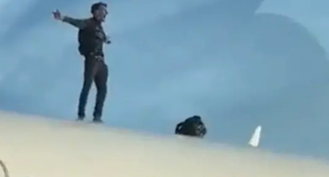 أظهرت لقطات مصورة الرجل يعتلي سقف الطائرة في مطار مانيسيس بمدينة فالنسيا، ولاحظه ركاب ينتظرون داخل مبنى المطار.