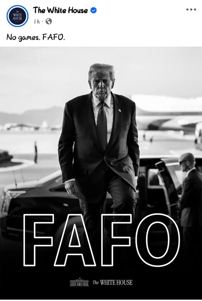 بمصطلح شعبي ولغة الإنترنت، سخرت إدارة الرئيس الأمريكي دونالد ترامب، من خصومه السياسيين ومنتقديه داخليًا وخارجيًا، إذ نشر البيت الأبيض، على صفحته بموقع التواصل الاجتماعي “فيسبوك”، صورة للرئيس بالأبيض والأسود وعليها مصطلح دارج في الثقافة الشعبية الأمريكية هو FAFO.