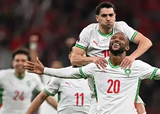 التعليق على الصورة،نجم المنتخب المغربي أيوب الكعبي محتفلا بالهدف الثاني الذي أحرزه في شباك منتخب